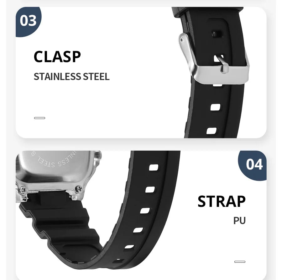 Sağlam kauçuk kasa ve PU kayış, günlük darbeler ve aktif yaşam koşullarına karşı üstün dayanıklılık sağlar.
